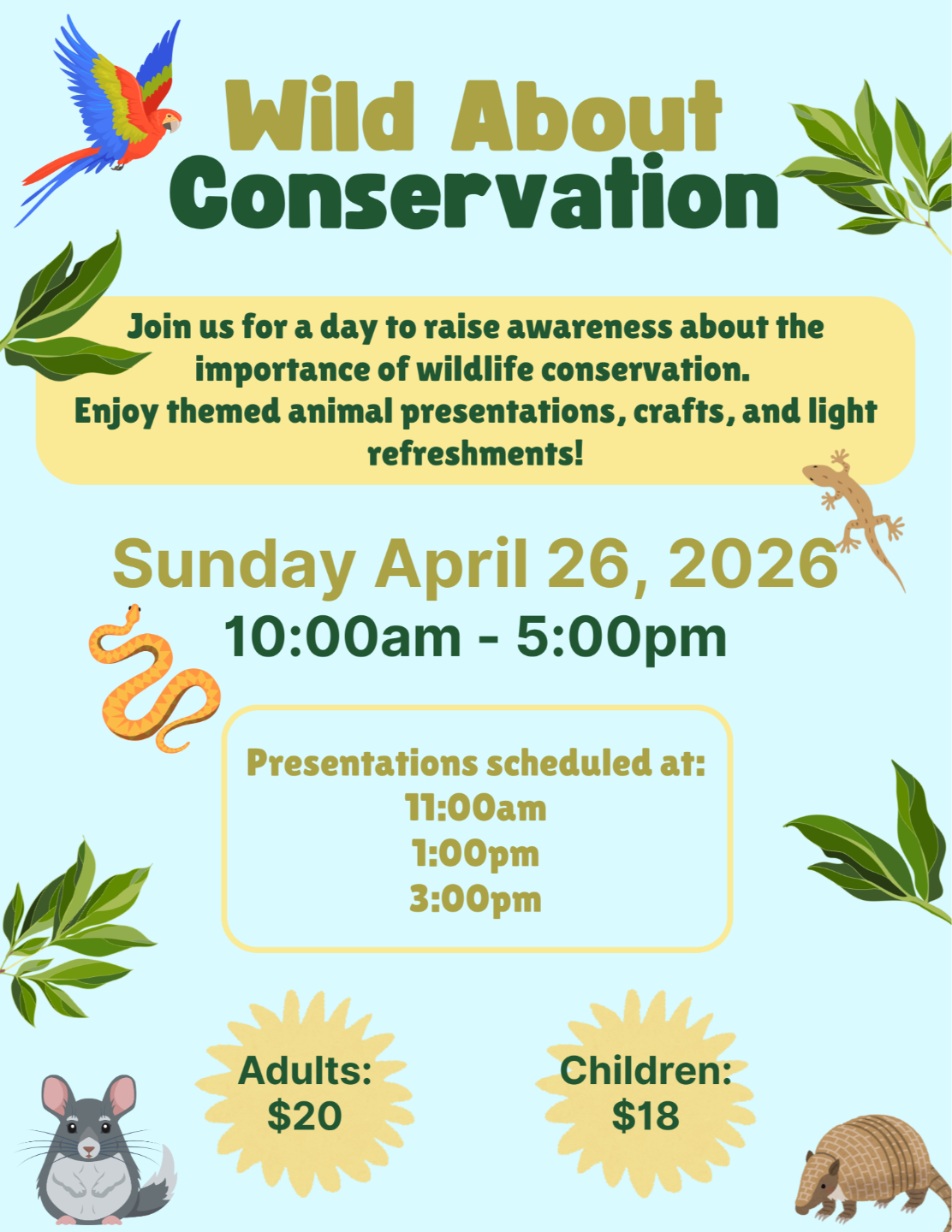 Join us for our Wild About Conservation event and learn about the roles that wildlife play in our environment and the importance of wildlife conservation! Explore the center, enjoy themed animal presentations, a craft station, and light refreshments.